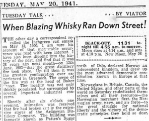 Ardgowan Distillery was hit on the first night. By the second, its stores of highly flammable alcohol had turned it into an inferno of blue flames so bright it acted as a beacon for Luftwaffe bombers. Witnesses reported seeing the flames from across the town, and a stream of burning whisky was said to have flowed down Baker Street (Greenock Telegraph, 20/05/1941).